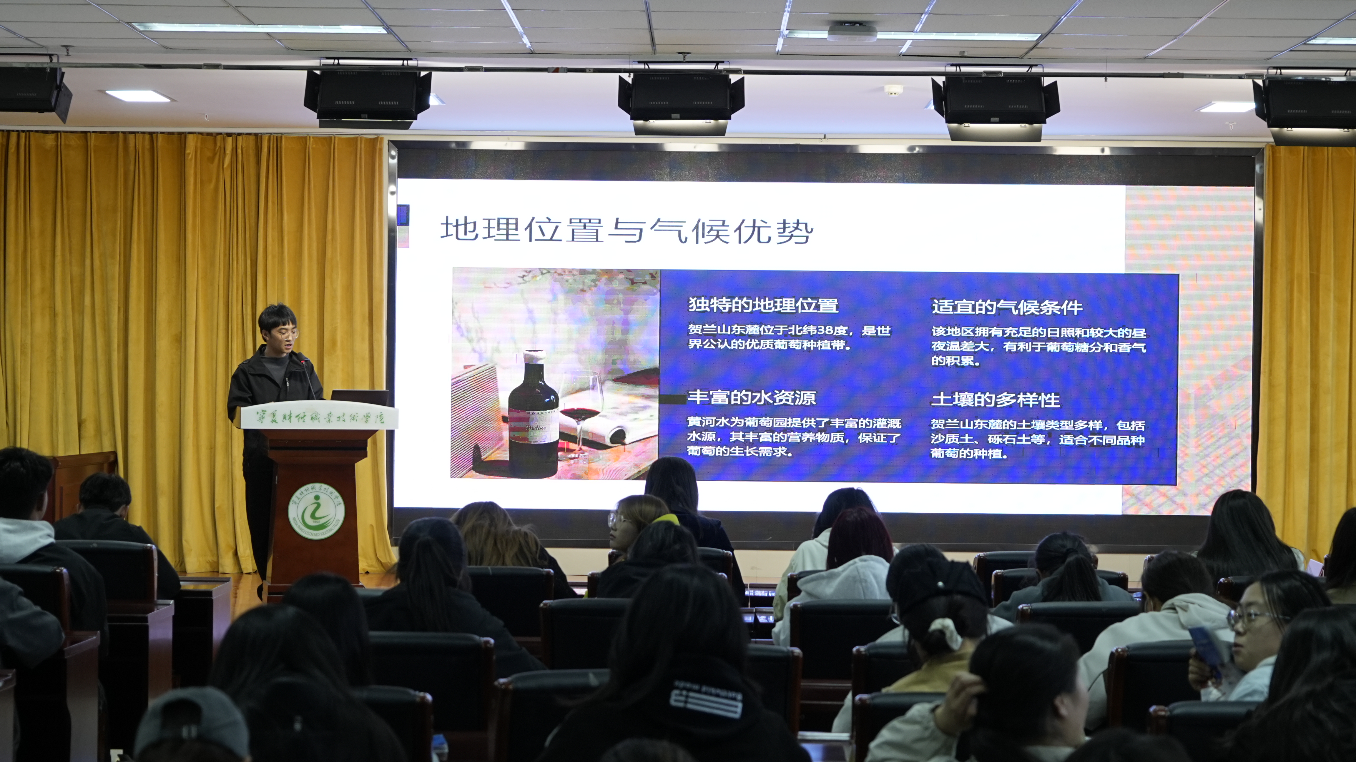 寧夏財(cái)經(jīng)職業(yè)技術(shù)學(xué)院的會(huì)場內(nèi)座無虛席,氣氛熱烈。結(jié)合寧夏財(cái)經(jīng)學(xué)院需求,活動(dòng)特別邀請(qǐng)了寧夏旅游研究院有限公司副總經(jīng)理常樂與寧夏海悅?cè)屎途魄f生產(chǎn)釀造板塊負(fù)責(zé)人趙樹云作為主講嘉賓。主講嘉賓從企業(yè)及個(gè)人背景介紹,再到分享文旅、葡萄酒行業(yè)發(fā)展見解,強(qiáng)調(diào)了創(chuàng)新與可持續(xù)發(fā)展的重要性,指出文旅及葡萄酒行業(yè)正面臨著消費(fèi)升級(jí)、數(shù)字化轉(zhuǎn)型等多重機(jī)遇與挑戰(zhàn),針對(duì)人才需求與職業(yè)發(fā)展提出建議,鼓勵(lì)在場學(xué)生拓寬視野,積極參與實(shí)踐,不斷提升自我競爭力。